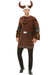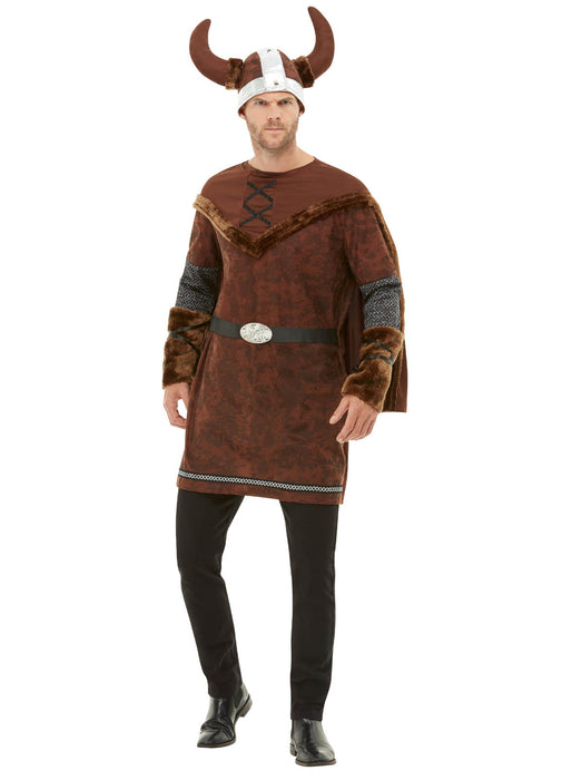 Viking fancy dress outfit with brown tunic with attached belt, cape and horned helmet.