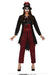 Voodoo lady Halloween costume with feathered top hat, tailcoat jacket with shirt and corset along with burgundy and black striped trousers.