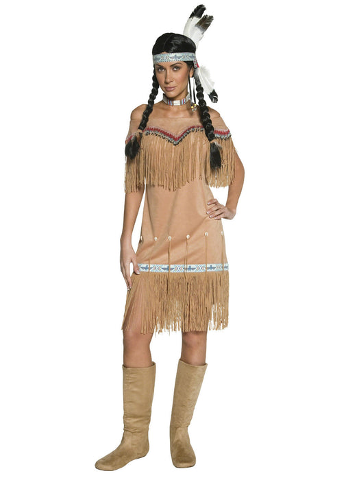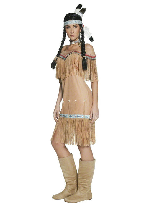 Indian Lady costume includes a tan suede effect dress with fringing and decorated with eagle pattern.