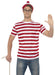 Where's Wally fancy dress costume kit consisting of red & white striped t-shirt, matching hat & black glasses.