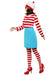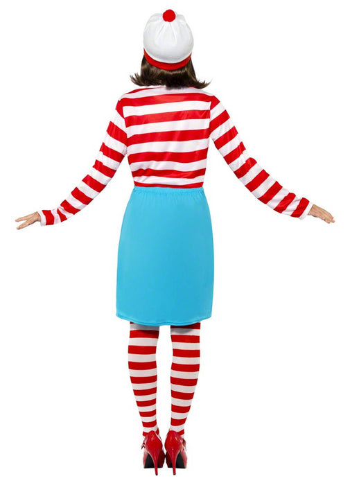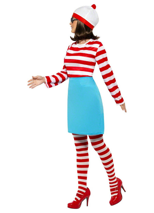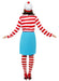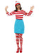 Where's Wally ladies Wanda costume includes stripped top, skirt, tights, black glasses and hat.