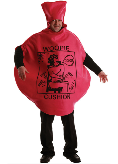Whoopie Cushion fancy dress costume consisting of pink material tabard with whoopie cushion print and face slot. One size fits most.