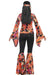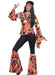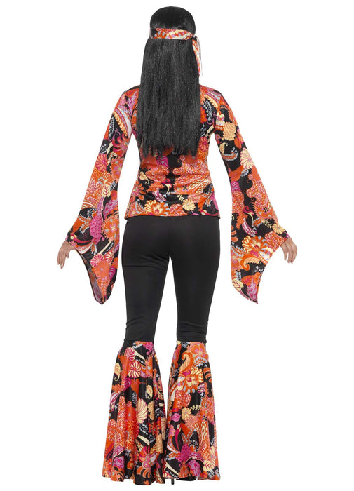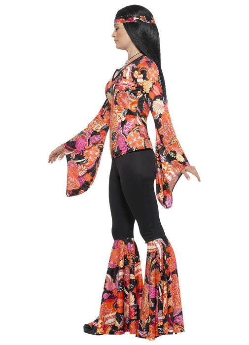 1960's Willow the Hippie fancy dress costume consisting of coloured floral top with draped sleeves, black elasticated trousers with matching floral design flares, headscarf & peace medallion.