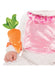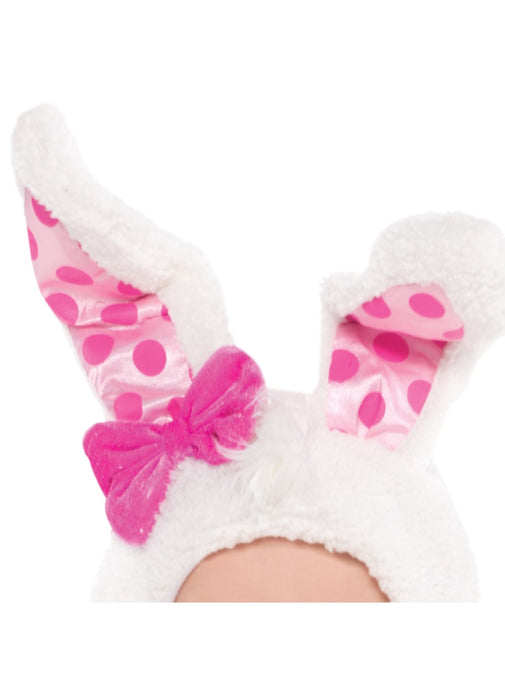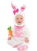 Little bunny rabbit baby and young toddler costume with fluffy white and pink jumpsuit, hood with ears and a carrot wrist rattle. Perfect for Easter time dress-up!