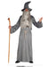 One size long length grey wizard costume with long tunic, belt and pointed hat.