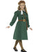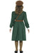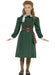 WW2 Evacuee fancy dress costume consisting of long green dress with black buttons, mini black bow and brown material belt, brown beret, over the shoulder brown bag & name tag.