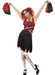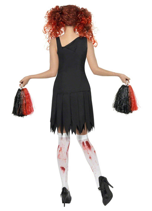 High School Horror Halloween Cheerleader fancy dress costume with black, red and white dress with blood stains and latex gore piece with the initials D E D on the front - get it! - along with two black and red pom poms.