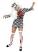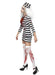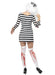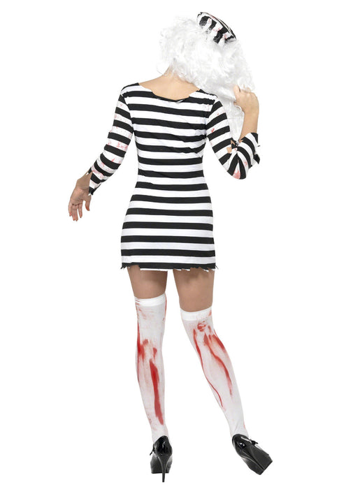 Black and white stripped convict costume which has been given the Halloween Zombie treatment with blood stained dress with latex heart piece and matching convict hat.