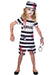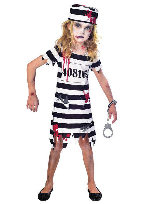 Girl's Zombie Convict Halloween costume with knee length dress with blood patches and matching hat.
