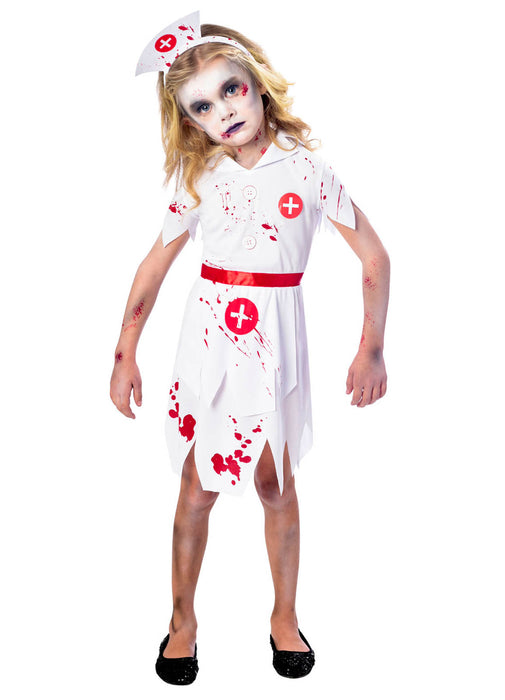 Bloody Halloween zombie nurse costume consisting of dress with apron piece and headband.