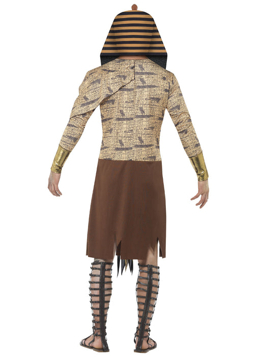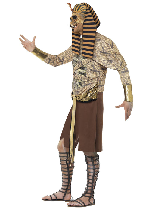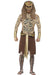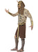 Costume includes tabard with brown skirt section and attached gold belt, pair of gold arm cuffs & half face latex mask with headpiece.