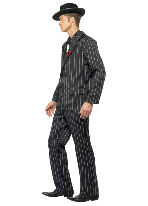 Gangster Zoot suit costume pack contains jacket with red rose, silky shirt front, tie and trousers.
